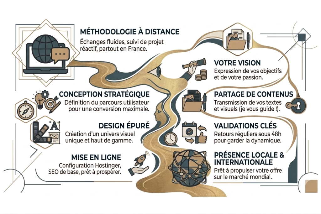 Configuration & Contenus : Je vous accompagne pour l’achat de votre hébergement (en profitant de mes -20% chez Hostinger via un accès collaborateur sécurisé). C’est aussi le moment où vous me transmettez vos photos, textes et éléments d’identité visuelle.